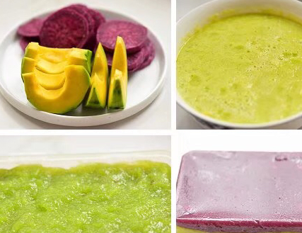 4、一層紫薯汁一層南瓜汁倒入模具中。放入冰箱冷藏2小時後,取出脫模切塊即可。食用的時候可以澆上蜂蜜口感更佳哦。