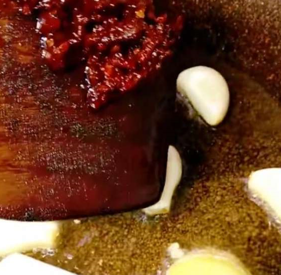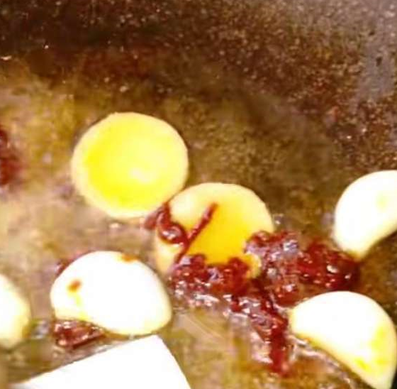 把鍋中的油倒出來,留少許,然後下入薑蒜、豆瓣醬炒。