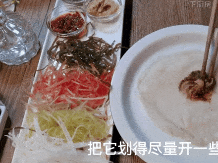 07.在面皮上加入豆豉醬、辣醬、黃芥末,攪動均勻,加入各類"絲絲",卷一卷,蘸上甜醋水,就可以開吃啦~