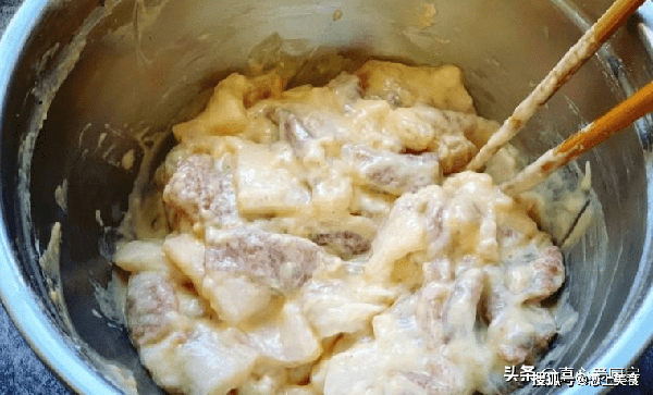 ②面糊要均勻裹著每一塊肉,要保證面糊的濃稠度適中,不然裹不均勻會導致炸制後外層不酥脆。