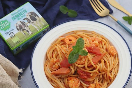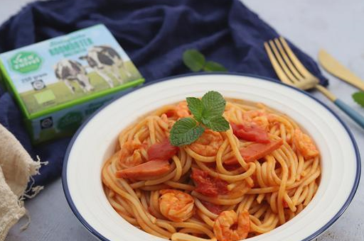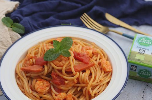 用料:意大利面一把,鮮蝦適量,西紅柿一個,火腿腸一根,意大利面醬兩大勺,樂荷有機黃油一小塊,鹽少許,迷迭香少許。