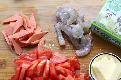 2,黃油切一小塊備用,火腿腸切菱形片,鮮蝦去頭去殼,清洗幹凈,西紅柿切厚片。
