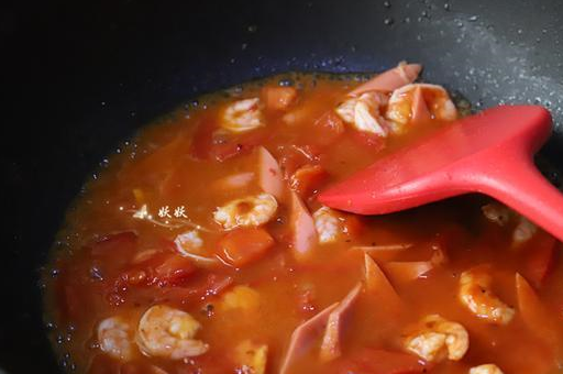 8,待蝦仁變色就可以加入適量的清水,兩大勺意大利面醬,少許迷迭香,將醬汁連同食材一起煮開。