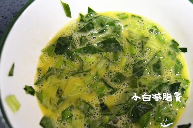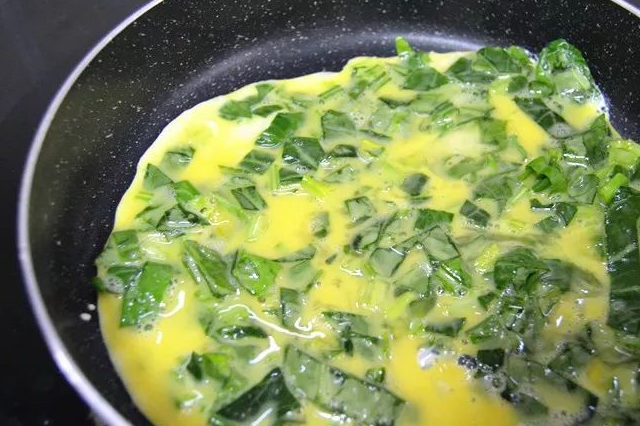 1、菠菜洗凈,切碎備用。雞蛋打散,加入菠菜碎、一點食鹽攪拌均勻。