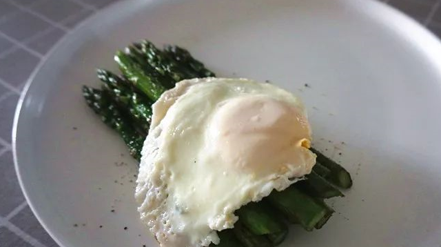 4、下面開始擺盤,在雞蛋和蘆筍上撒些食鹽和黑胡椒即可。