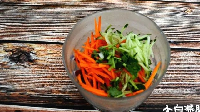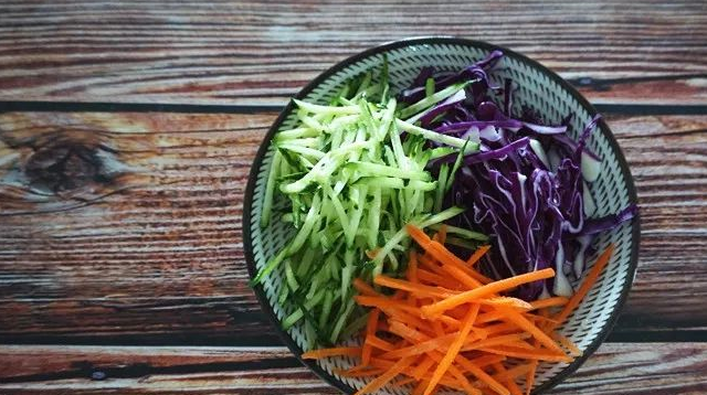 2、黃瓜、胡蘿卜擦絲,紫甘藍切絲。