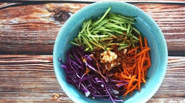 1、紫甘藍、胡蘿卜、黃瓜洗凈切成絲(用擦絲板更方便),放入蒜泥、香菜、生抽、香油、食鹽拌勻即可。