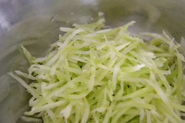 5、萵筍去皮擦成絲,放到沸水裡燙幾十秒撈出,過下涼水。