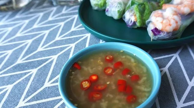 6、現在來做春卷蘸料:半個檸檬擠出汁,加上蒜末、小米辣、魚露(沒有可以用生抽代替)拌勻即可。(也可以直接沾甜辣醬或甜梅醬,自己註意下熱量就好)