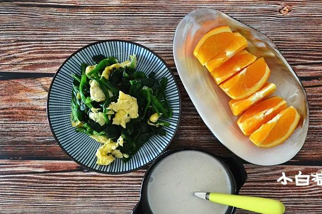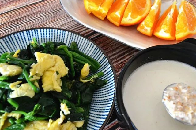 五、燕麥、低脂牛奶、雞蛋炒菠菜、橙子