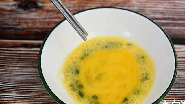 2、雞蛋打散,放入香蔥、食鹽拌勻。