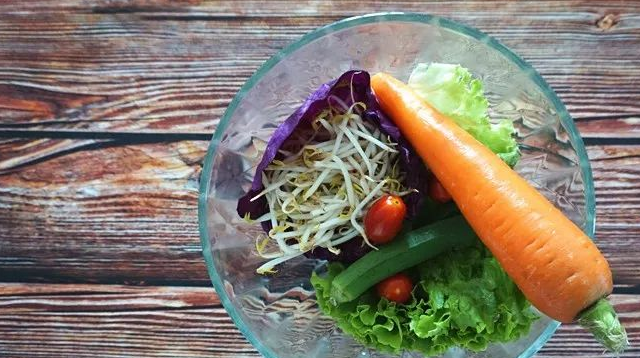1、150g蔬菜洗凈,胡蘿卜、紫甘藍切絲、聖女果切片、生菜葉掰小塊。