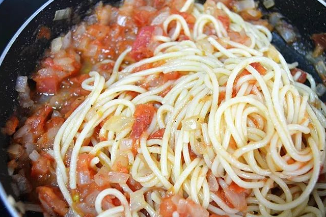 9、將煮好的意面下入鍋中,用筷子翻拌均勻即可盛出。
