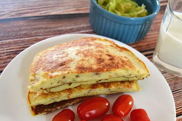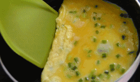 3、平底鍋刷一層薄油(用噴油壺也可以),倒入蛋液,小心用鏟子卷起,待蛋液完全凝固,盛出切塊。