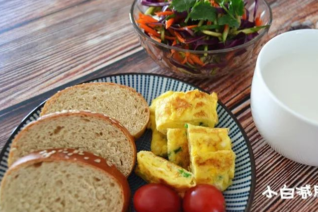 一、全麥面包、煎蛋卷、涼拌菜、牛奶、聖女果