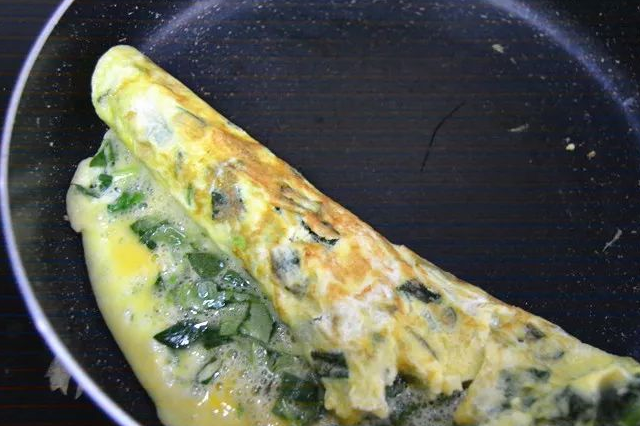 3、鍋開小火,待蛋液底部凝固,用鏟子和筷子配合將雞蛋餅卷起。