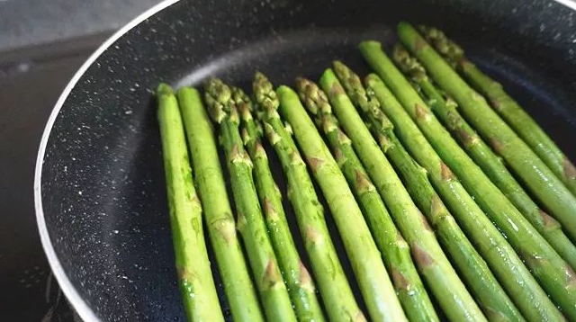 2、不粘鍋中倒入5g植物油,中火加熱,下入處理好的蘆筍煎至深綠色,裝盤備用。