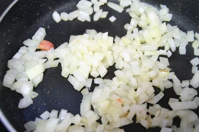 7、鍋中倒入一點油,先下入洋蔥丁炒軟。