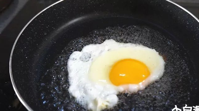 3、利用鍋裡殘留的植物油,打一個雞蛋,煎至底部定型,加入一點清水,蓋上鍋蓋將蛋煎熟。(雞蛋差不多熟瞭之後將鍋蓋打開,等水全部幹瞭再停火)