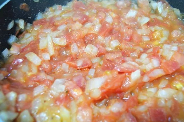 8、再下入西紅柿丁炒軟,最後加入食鹽、羅勒葉調味。