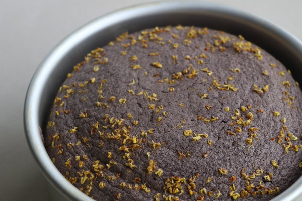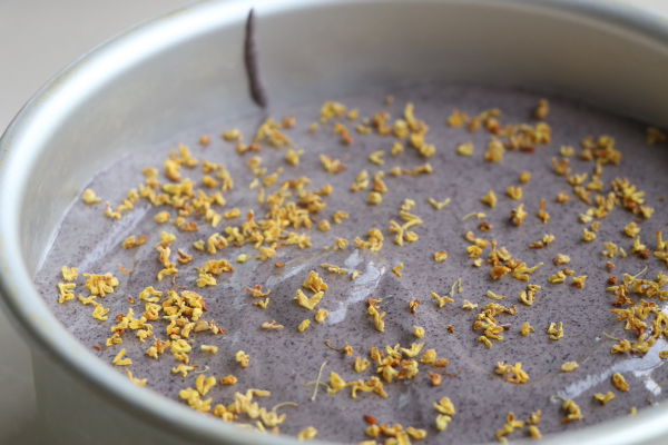 7、拌好的米糊倒入6寸戚風模具裡,把表明稍微整平,清震2下震出大氣泡,然後撒適量的幹桂花上去;