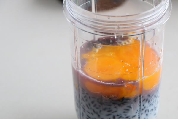 1、黑米提前浸泡一個晚上,然後清水沖洗2遍,撈出後瀝幹水分,放入料理杯裡,加入3個蛋黃、80克牛奶攪打成細膩的米糊;