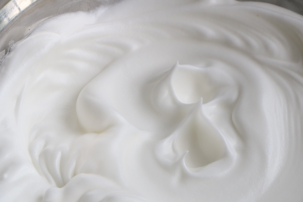 4、3個蛋清分次加入40克左右白糖打發,打到提起打蛋器有直立的尖角時就可以瞭。裝蛋清的盆要幹凈無油無水;