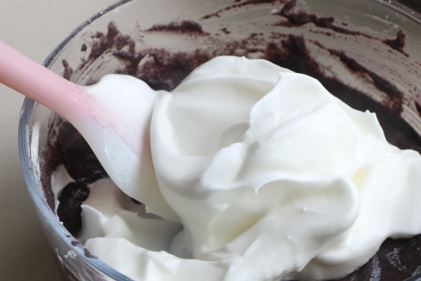 6、然後把拌好的米糊倒入剩下的蛋白裡,用同樣的手法拌均勻;最後拌好的狀態蓬松柔軟細密;