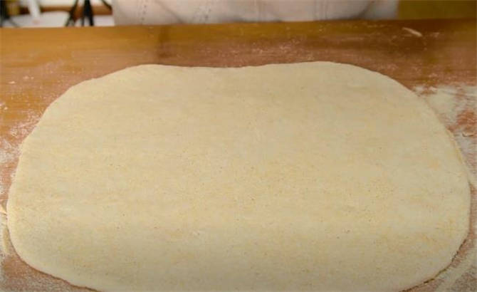 7.案板上撒一些剛才打好的黃豆面,這是剛才炒好的面團,再撒一層,用搟面杖把它搟開,如果覺得黏的話就再撒一些,反復按一按,像這樣搟平就可以瞭。