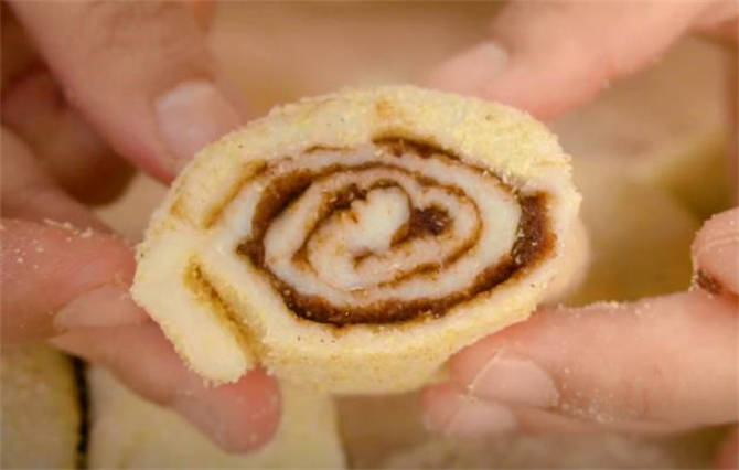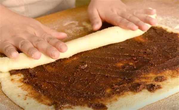 8.再塗抹上豆沙餡,豆沙都平鋪好之後卷起來。