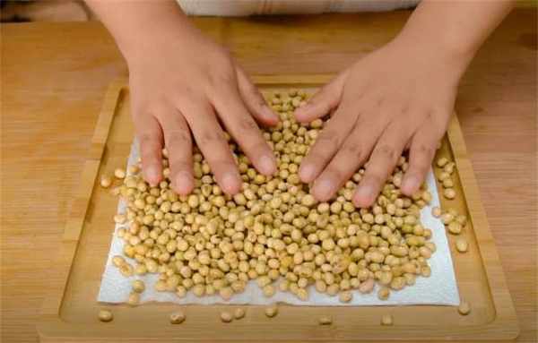 1.在盆子裡倒入一些黃豆,倒入清水,把黃豆淘洗幹凈,淘洗幹凈後瀝幹水分,放到盤子裡。