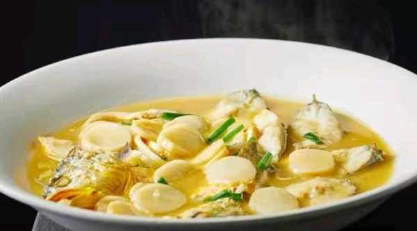 起鍋燒熱油,放入豬油、幹蔥頭、蒜頭、薑塊煸香,再放入切好的黃魚煎一到兩分鐘,加入調料和高湯,再加入年糕,大火燒開後轉小火煨制十分鐘左右。