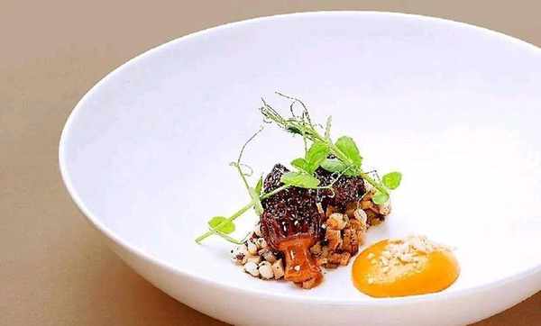 幹香菇泡發後切碎,薏米浸泡後清洗幹凈,把香菇碎和薏米用黑松露醬炒香墊入盤中,放上燒制好的釀羊肚菌。