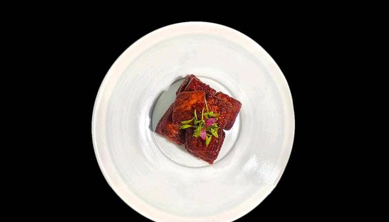 鮮豬頸肉加入蔥薑、陳皮、九制陳皮、幹辣椒、花雕,用高壓鍋壓30分鐘直至酥爛,撈出後放入托盤中晾涼,再入冰箱冷凍變硬後改刀。