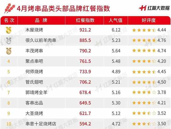 在4月份的烤串品類分榜中,木屋燒烤、很久以前羊肉串以及豐茂烤串占據前三席位,聚點串吧、何師燒烤、管氏翅吧等緊隨其後。