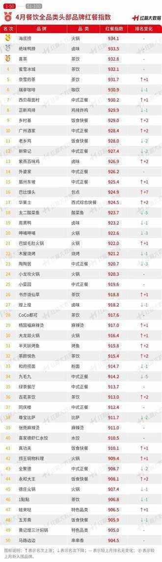 總體來看,在4月“餐飲品類的品牌力百強榜”中,品牌名次上升的有37個,名次下降的有39個,名次保持不變的有23個,新上榜品牌1個。