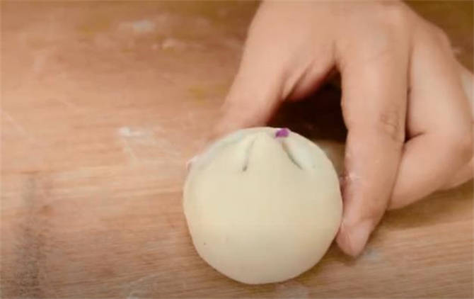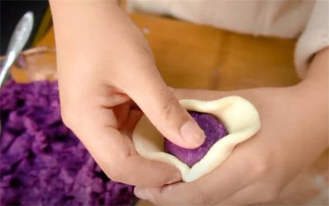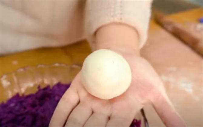 6.把紫薯餡團成小圓球,放在餅胚裡面,利用虎口的地方把它收緊。