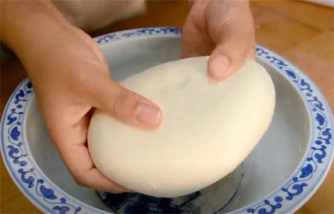 4.現在這個面已經發好瞭,把它取出來,上面撒一些幹面粉揉搓排氣,揉到原來的大小就可以瞭,把它整理成長筒的形狀,開始下劑子。