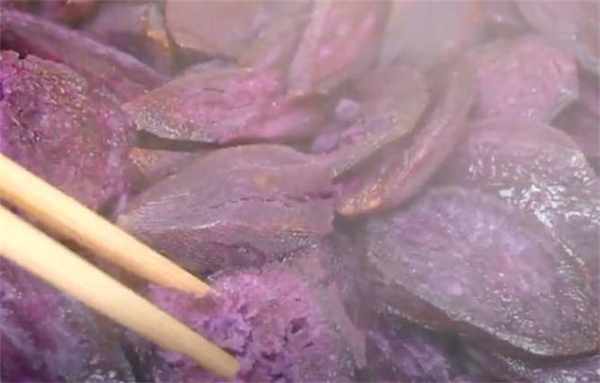 2.先處理一下這個紫薯,然後再把這個紫薯切成薄片,把切好的紫薯放到蒸鍋裡面,大火燒開蒸25分鐘左右,這時候這個紫薯就已經蒸好瞭,看這個軟糯的狀態。