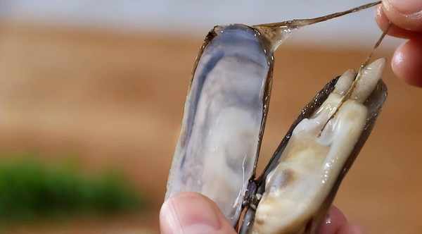 3、 等到蟶子全部開口之後,將裡面的蟶子肉全部取出來,將旁邊的的黑色的膜撕掉;