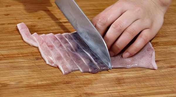 2、 魷魚對半剪開,將內臟處理幹凈,然後切成條狀;