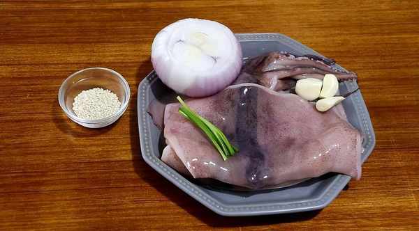 準備食材:魷魚、洋蔥、大蒜、小蔥、孜然、辣椒面、生抽、白芝麻、黑胡椒、蠔油、五香粉