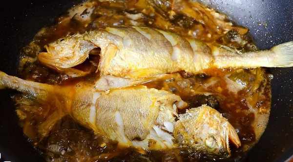 5、 接著加入一些清水,加入適量蠔油、生抽、鹽、白糖和醋,調節鮮味,將大黃魚放入進去,開中火燜煮一會;