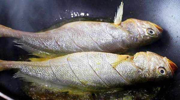 3、 鍋中倒入油,油熱將黃魚擦幹上面的水分,放入鍋中兩面都煎一下,盛出備用;