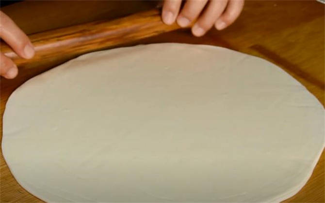 7.按到最大程度的時候,就用搟面杖均勻的用力搟開,搟成這麼大就差不多瞭,搟好之後用搟面杖卷起來。