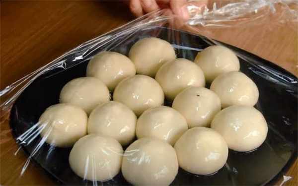 4.拿一個盤子過來,在底部刷一層油,把剛才團好的劑子放進去,在劑子表面刷一層油鎖住它的水分,蓋上保鮮膜餳面40分鐘。