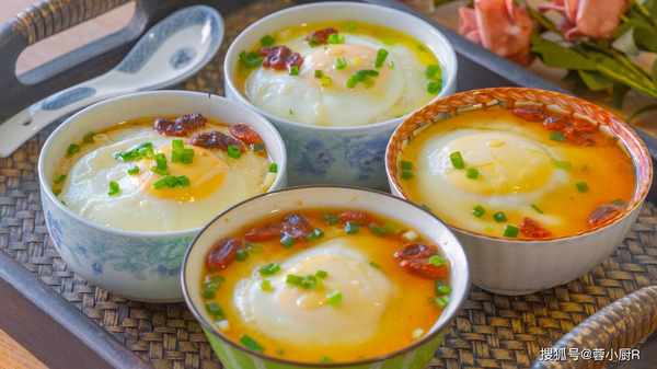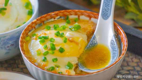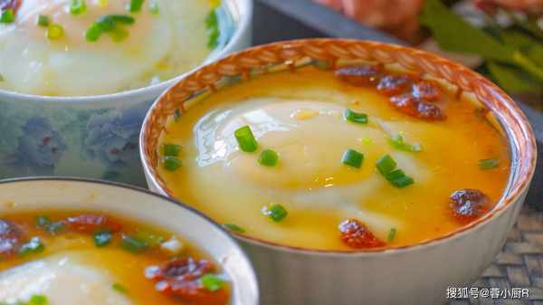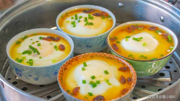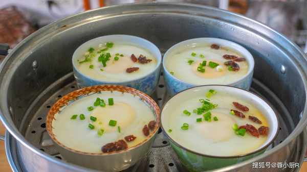 10、蒸肉餅的時間我們來切點蔥花,再泡一小把枸杞。8分鐘後我們開蓋看一下,蛋液凝固後再往每個小碗裡倒適量開水,然後放上枸杞和蔥花。