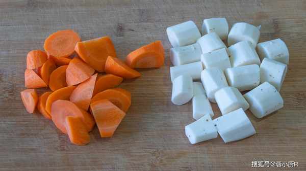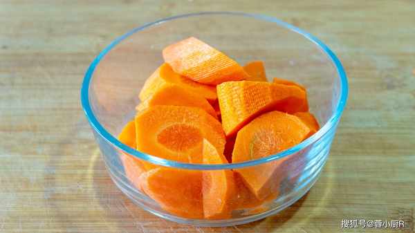 2、再來一根胡蘿卜,削皮後也切成大塊兒。