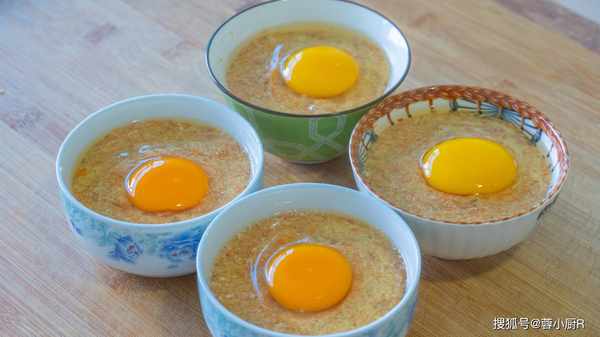 8、準備幾個小碗,再分別舀入2大勺肉餡兒,表面用勺子鋪平,然後在中間位置挖一個小坑,打入一個雞蛋。