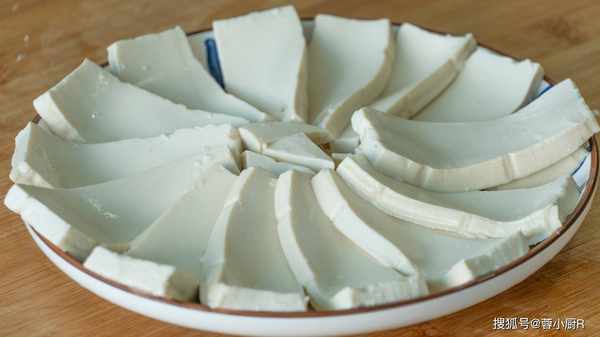 1、豆腐一塊兒,先切成厚片,接著擺入盤中。